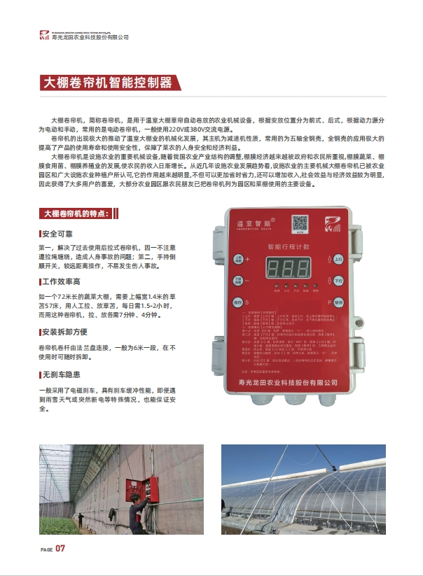壽光龍田農業科技股份有限公司于2014年創立于“蔬菜之鄉”----山東壽光。公司立志用科技服務三農,以幫助農業企業和個人提高農業生產率,協助農業企業和個人生產健康安全的高品質農產品為使命。踐行“自強不息,厚德載物”的企業理念,專注于設施農業裝備研發,研發生產了“溫室智腦”智慧農業物聯網系統、大棚智能放風機,“龍抬頭”大棚運輸車,“春暖花開”紅外反射大棚保溫被,大棚卷簾機等系列產品。公司于2017年在齊魯股權交易中心掛牌上市,股票代碼302505。 公司擁有注冊商標12個,實用新型專利18項,外觀專利4項,并獲得了ISO9001質量管理體系認證證書,2021-2023年科技型中小企業稱號。溫室智腦大棚放風機,獲得2020年度農業農村部舉辦的創新比賽優秀獎。 2022年,中央網信辦、農業農村部、國家發展改革委、工業和信息化部、國家鄉村振興局聯合印發的《2022年數字鄉村發展工作要點》又進一步細化了智慧農業在2022年的重點任務,龍田農科將抓住歷史機遇,打造智能化的系列裝備,讓農業生產更高效,更智能。